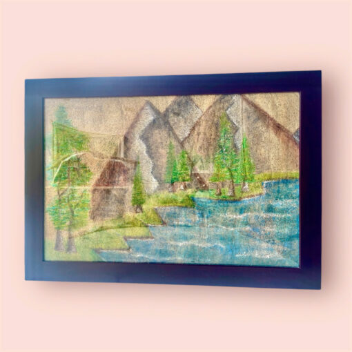 Bức tranh khắc họa khung cảnh thiên nhiên với hồ nước xanh biếc ở tiền cảnh, những hàng cây thông xanh tươi mọc ven bờ, phía sau là dãy núi đá sừng sững. Toàn bộ khung cảnh được viền trong khung gỗ đen, tạo cảm giác hài hòa và ấm áp.