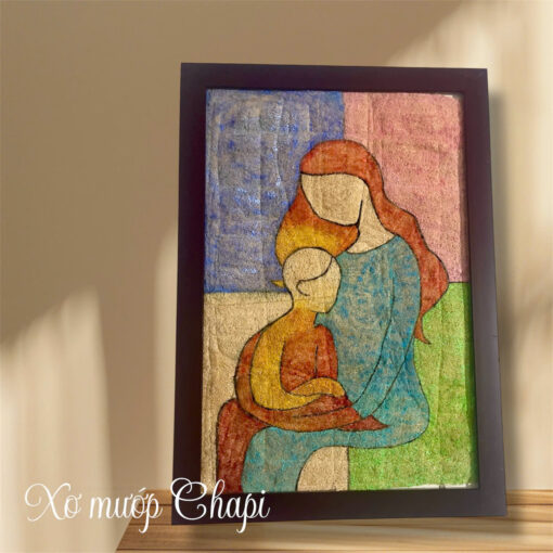 Bức tranh khắc họa hình ảnh trừu tượng của một người mẹ dịu dàng ôm con vào lòng. Các mảng màu xanh, đỏ, vàng và tím phối hợp hài hòa, tạo cảm giác ấm áp, gần gũi và yêu thương.